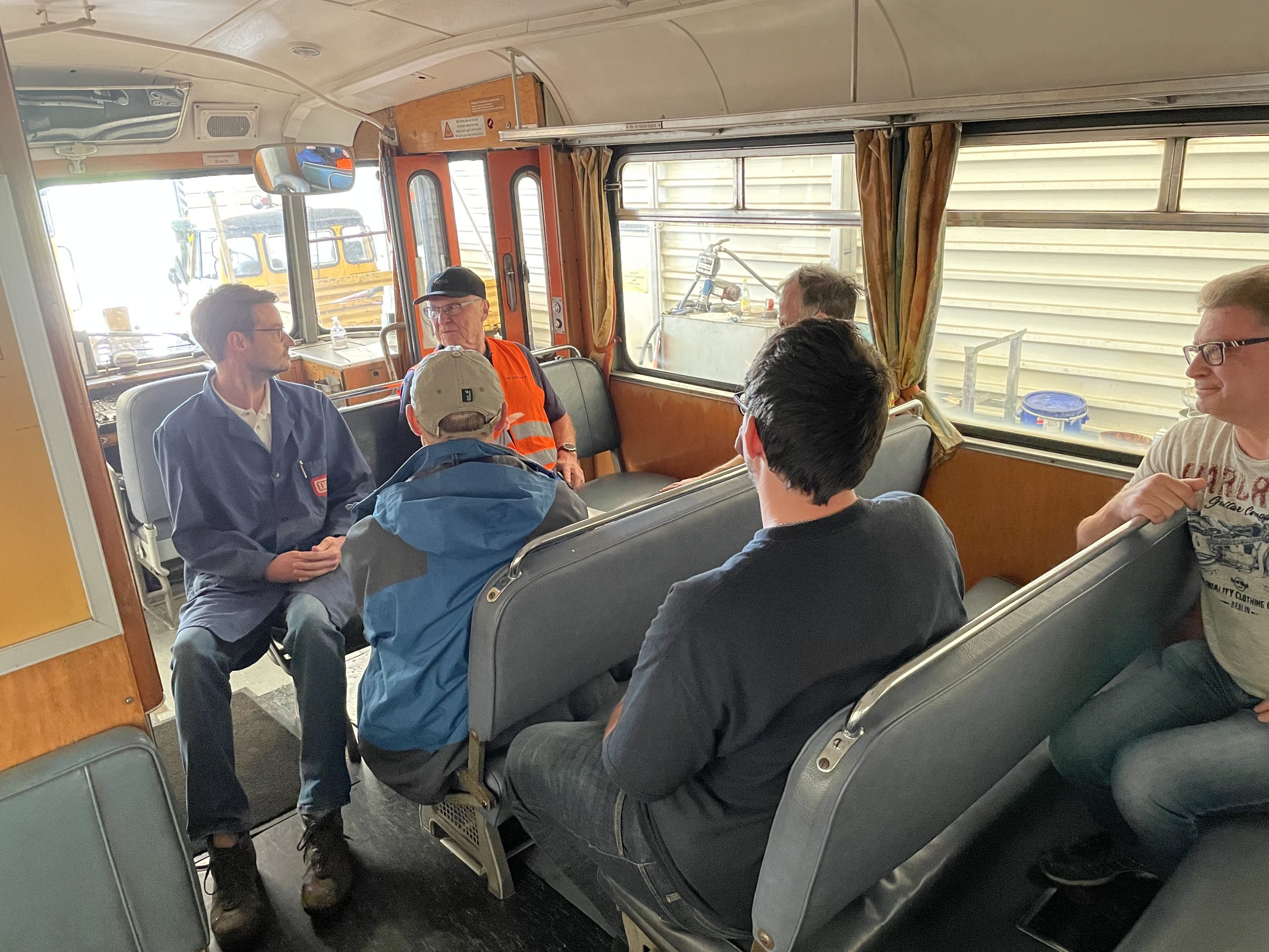 Der Tag begann mit einer Werkstattführung durch einen ehrenamtlichen Helfer der DFS. Hier hat uns vor allem die große Anzahl an verschiedenen Lokomotiven und Wagen beeindruckt, haben wir doch ,,nur“ unseren Schienenbus und ein paar Baufahrzeuge wie Bagger und SKL. Wir lauschten gespannt den Erzählungen unseres Gästeführers, der uns von den aktuellen Projekten erzählte, welche unter anderem auch einen Schienenbus anderer Bauart umfasst. Besonders beeindruckt waren wir von einer elektrisch betriebenen Akku-Lokomotive aus den 60er Jahren, welche die Strecke einmal komplett abfahren kann.