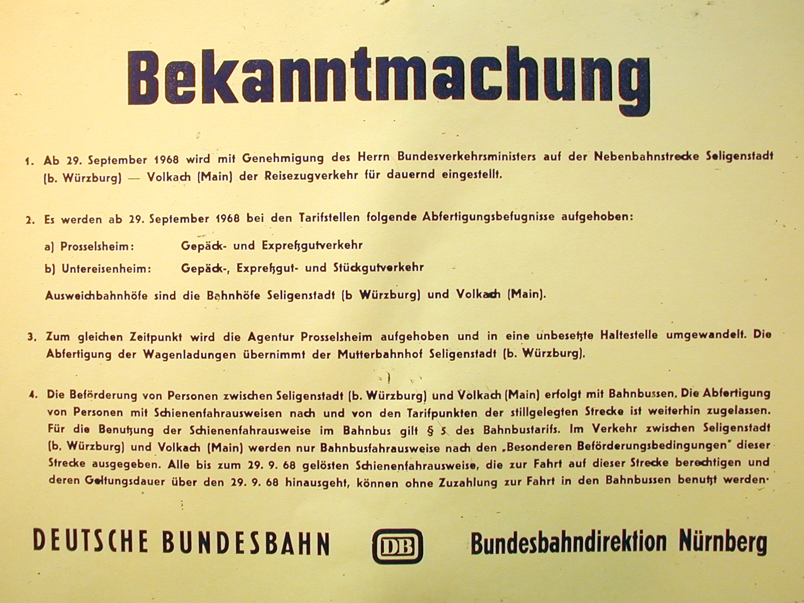 Allerdings, dieser moderne Zug pendelte 1968 nur einmal am Tag zwischen Volkach und Würzburg. Alle anderen Fahrten hatte inzwischen der Bahnbus übernommen. Wenig geliebt – so damalige Umfragen – war er hier bereits ab 1963 immer häufiger im Einsatz, von Jahr zu Jahr wurde der Bahnfahrplan ausgedünnt. Wer konnte, der nutzte daher immer häufiger Moped, Motorrad oder sein eigenes, neu gekauftes Auto. Gleichzeitig mit dem Personenzugverkehr endeten 1968 in Eisenheim und Prosselsheim auch der Gepäck-, Express- und Stückgutverkehr. Ersatzstationen war nun Volkach und Seligenstadt b.W.