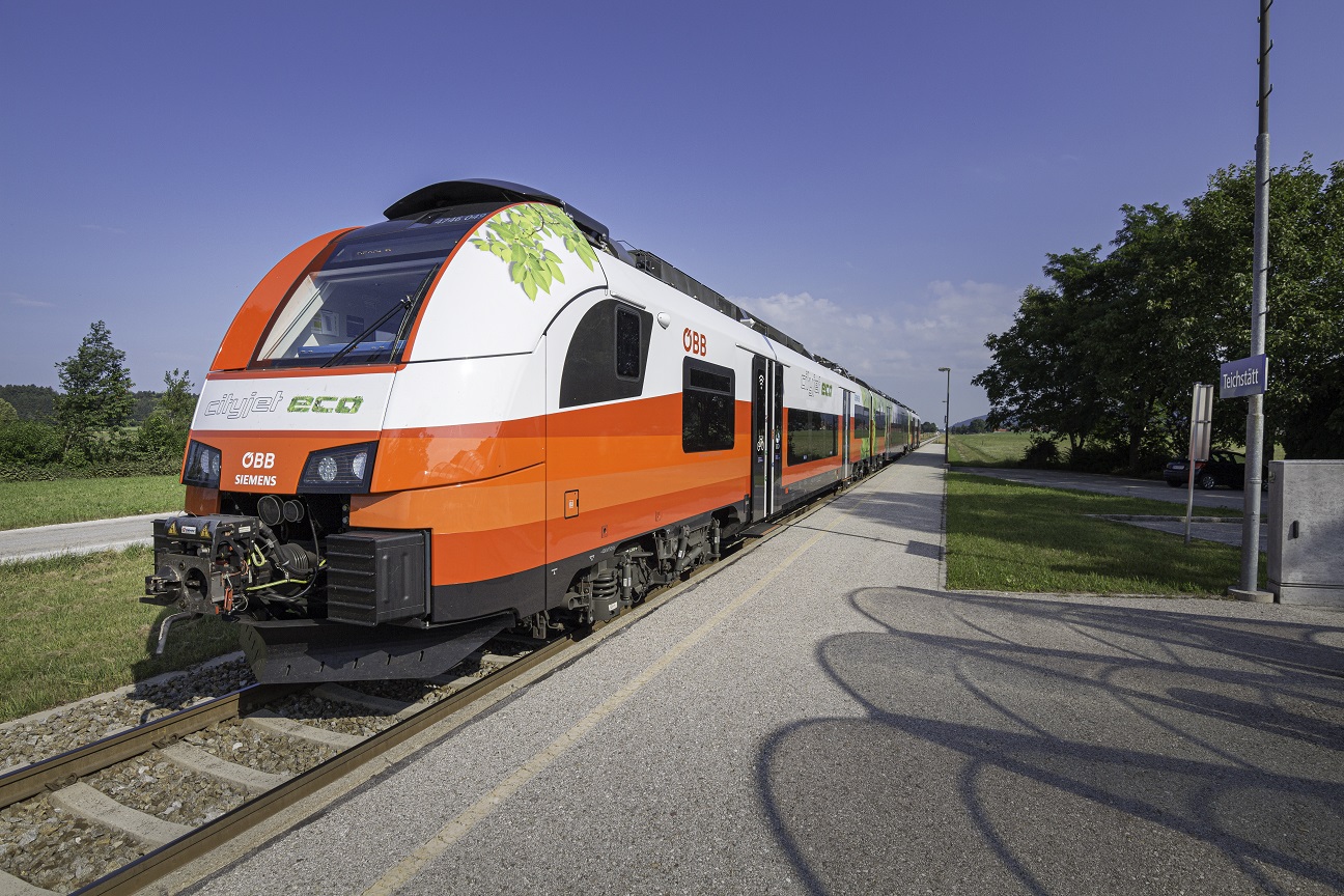 Blick in die Zukunft: Moderne Hybridtriebwagen würden bei einer Reaktivierung statt des roten Schienenbusses eingesetzt. Eines Tages könnten sie zwischen Würzburg und Seligenstadt unter der Oberleitung fahren. Von Seligenstadt nach Volkach ginge es dann weiter mit Strom aus den Fahrzeugbatterien.