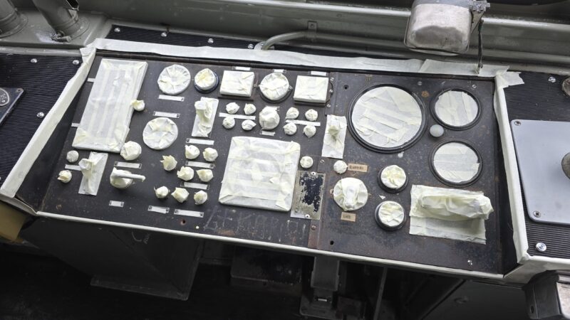 Die optisch arg in die Jahre gekommen Bedienpulte in den Führerständen bekommen eine optische Auffrischung. Viel Arbeit und Zeit die notwendig ist – jedoch später im Betrieb wenig beachtet wird.