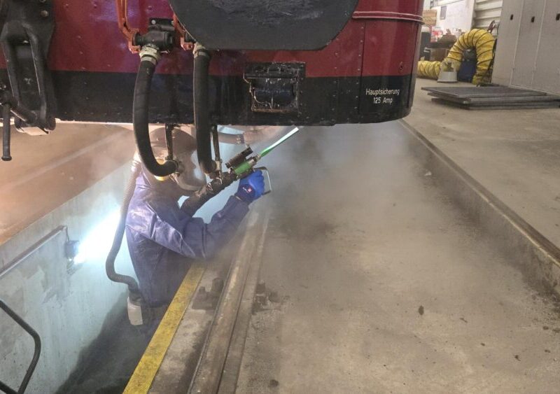 Sinnvoll für Fahrzeug aber auch den ausführenden Mensch ist es, zu Beginn der Arbeiten erst einmal eine gründliche Reinigung des Fahrwerks, in dem sich die meisten der zu überprüfenden Komponenten wie z.B. Bremsen und Druckbehälter befinden, vorzunehmen. Das diese Arbeit nicht sonderlich beliebt ist, dürfte verständlich sein. Früher wurde solch eine Arbeit mit der Drahtbürste vorgenommen, was jedoch sehr langwierig war. Auch kam teilweise Bremsenreiniger zum Einsatz, aus Umweltgesichtspunkten nicht die empfehlenswerteste aller Alternativen. Dank einem freundlichen Hinweis der Würzburger Straßenbahn haben wir deshalb zur Fahrwerksreinigung eine interessantes, alternatives Verfahren ausprobiert – Trockeneis.