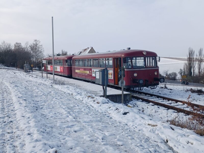 Um für die anstehenden Nikolausfahrten gerüstet zu sein, wurde der Schienenbus durch unsere Werkstatt einer Inspektion unterzogen und für den Winterbetrieb vorbereitet. Bei der anschließenden Probefahrt entstanden schöne Aufnahmen von der ungewöhnlich winterlichen Mainschleife. Erstaunt waren die vierbeinigen Landschaftspfleger vom ungewöhnlichen Gefährt in der Nachbarschaft. Der Nikolaus freut sich auf viele leuchtende Kinderaugen!