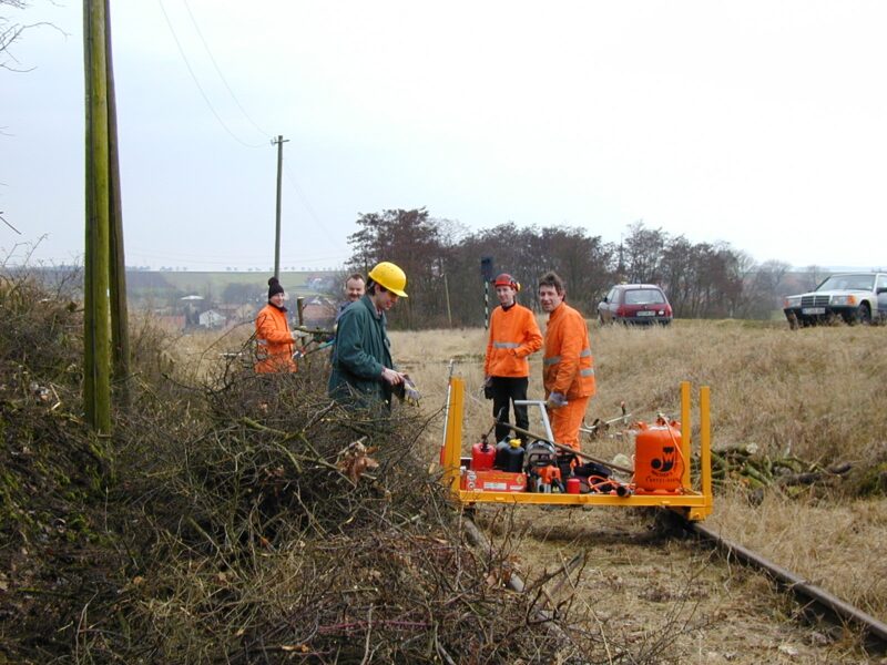 Vor diesem Einsatz hatten wir jahrelang Gespräche mit der Deutschen Bahn, dem Bayerischen Verkehrsministerium, dem Landratsamt Kitzingen und der Würzburger Straßenbahn geführt. Unser Ziel war damals, die 1994 von der DB stillgelegte Volkacher Strecke zu erhalten – zunächst für den Tourismus, später auch für den regulären Schienenpersonennahverkehr nach Würzburg. Daraus entstand ein umfangreiches Reaktivierungskonzept. Da bereits erste Gespräche mit der DB über einen Pachtvertrag liefen, erteilte uns die Bahn schließlich die Erlaubnis zum Freischnitt – allerdings auf eigene Gefahr und auf eigene Kosten.